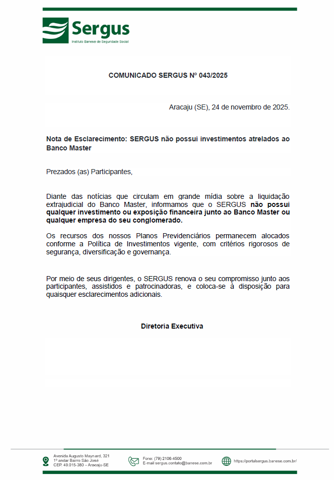Ref.: Nota de Esclarecimento: SERGUS não possui investimentos atrelados ao Banco Master